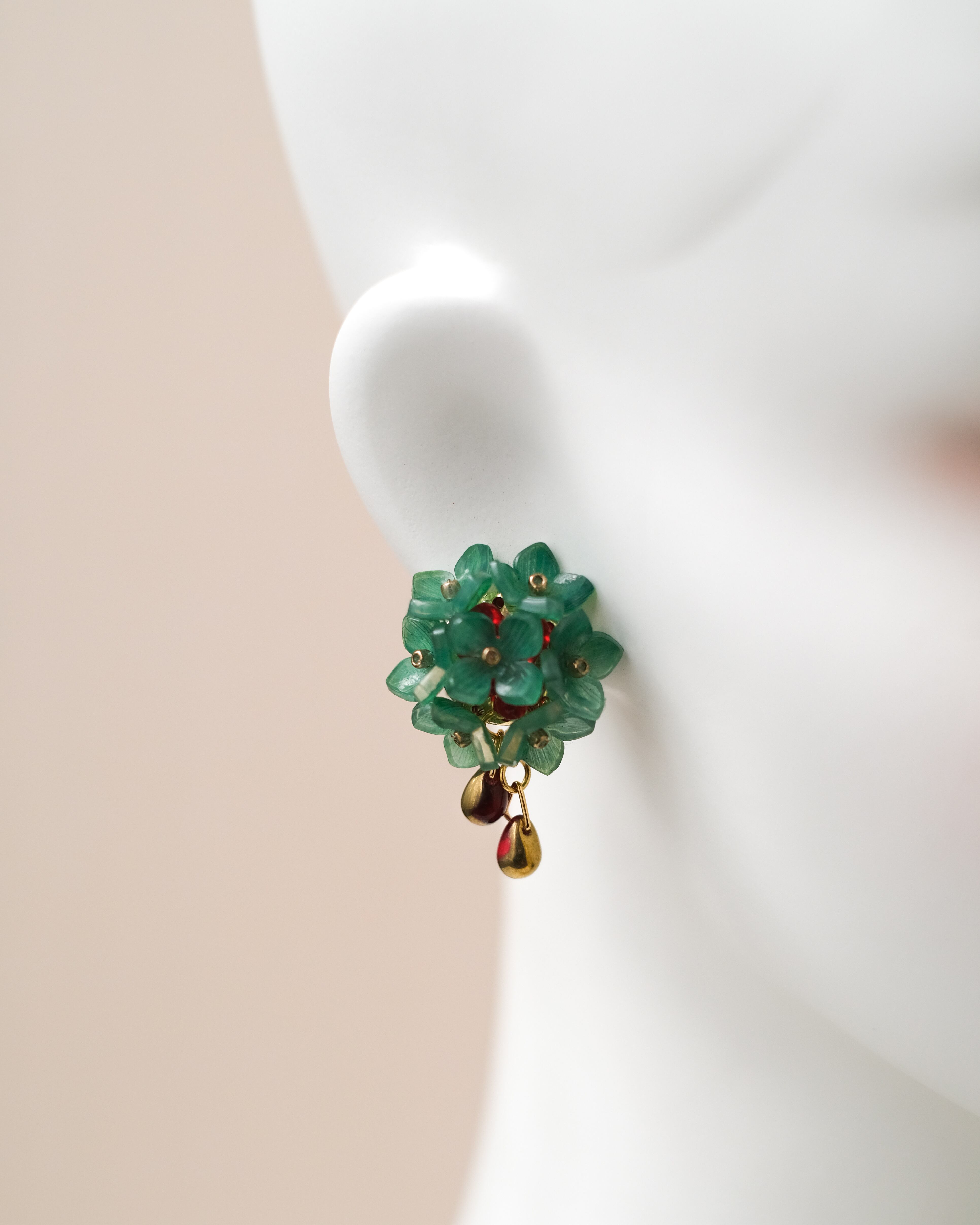 クリスマスの彩りを閉じ込めた、一房の紫陽花の耳飾りです。
