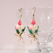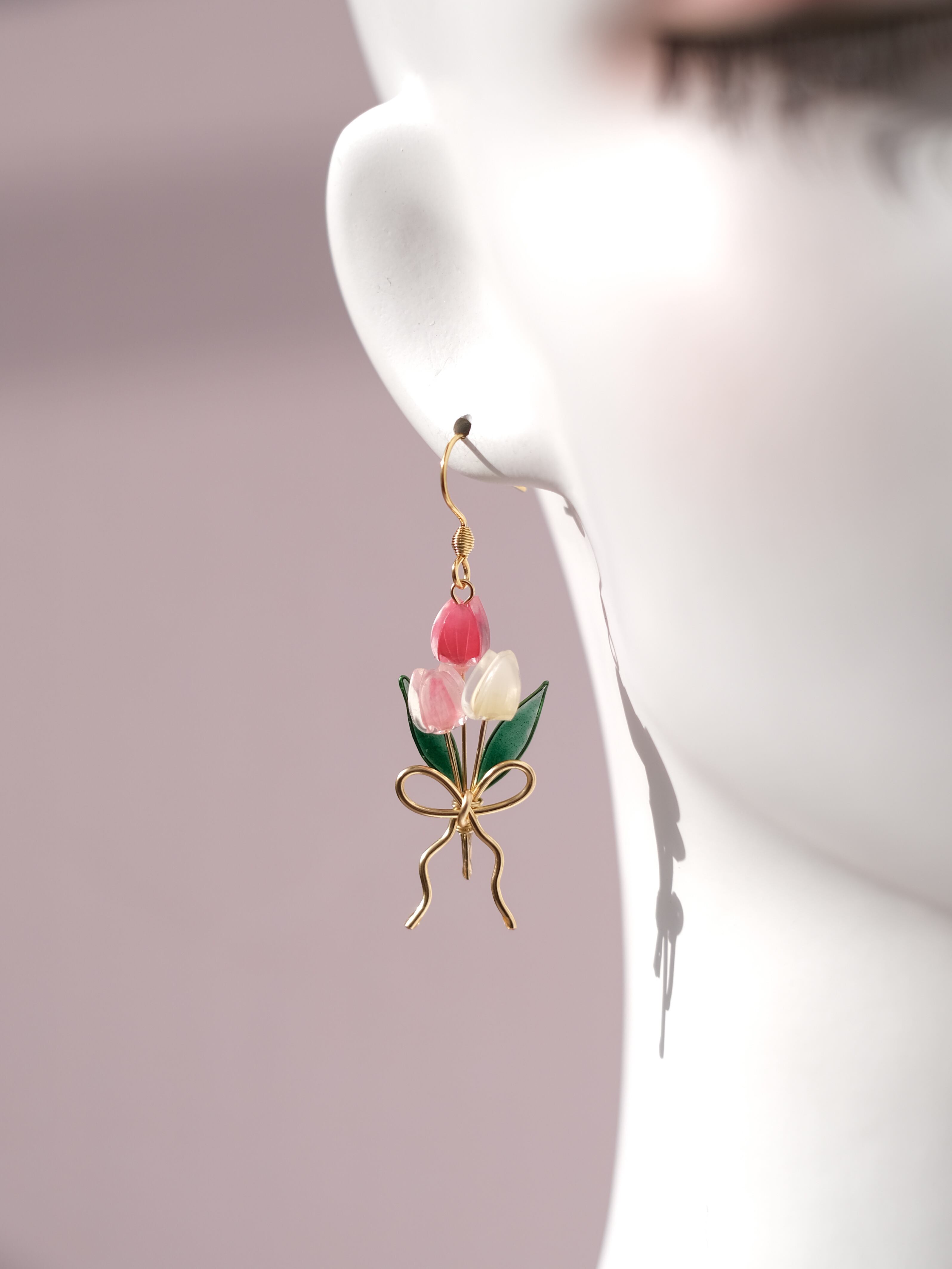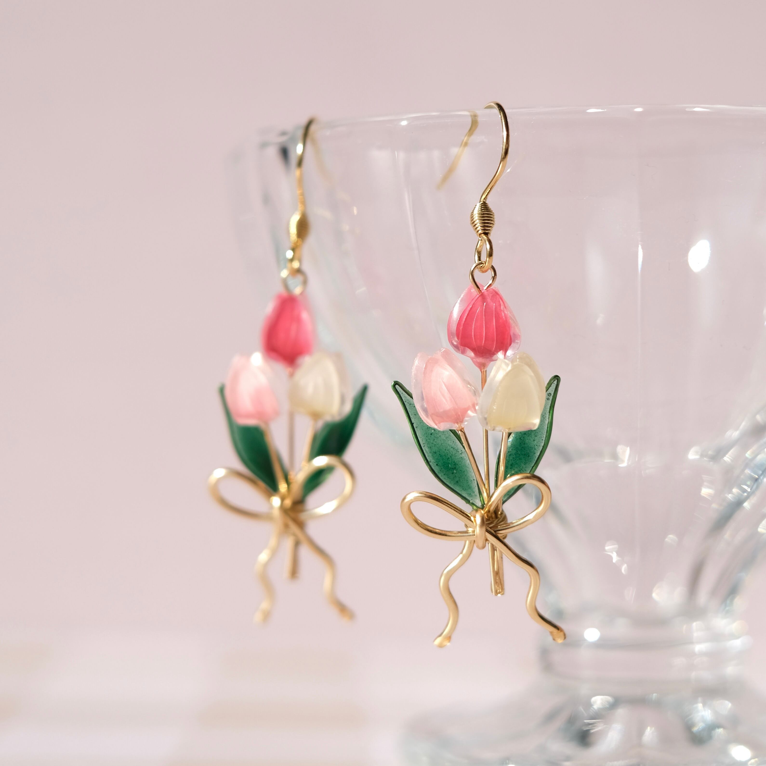 赤、薄桃、レモン色の温かな色合いのチューリップに、